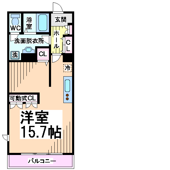 お部屋は15.7帖あり、可動式クローゼット・エアコンが付いております。